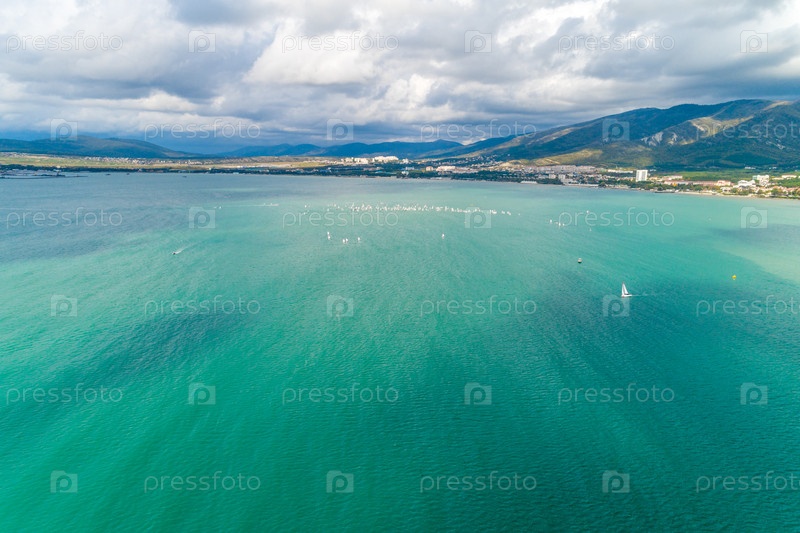 Яхтенные соревнования в Геленджикском заливе. Много небольших яхт на воде. Вид с воздуха. Кавказские горы на заднем плане. Детская регата