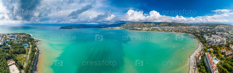 Панорама Геленджикского залива в солнечный день. Вид с воздуха. Красивая зеленая вода, много парусов, Кавказские горы на заднем плане. Пляж и прогулка протекают по бухте