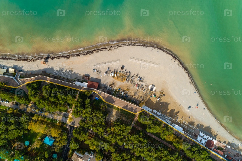 Панорама Геленджикского залива в солнечный день. Вид с воздуха. Красивая зеленая вода, много парусов, Кавказские горы на заднем плане. Пляж и прогулка протекают по бухте