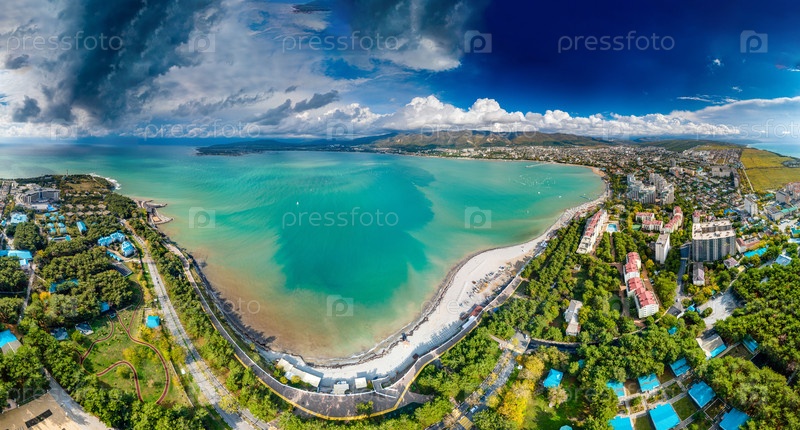 Панорама Геленджикского залива в солнечный день. Вид с воздуха. Красивая зеленая вода, много парусов, Кавказские горы на заднем плане. Пляж и прогулка протекают по бухте