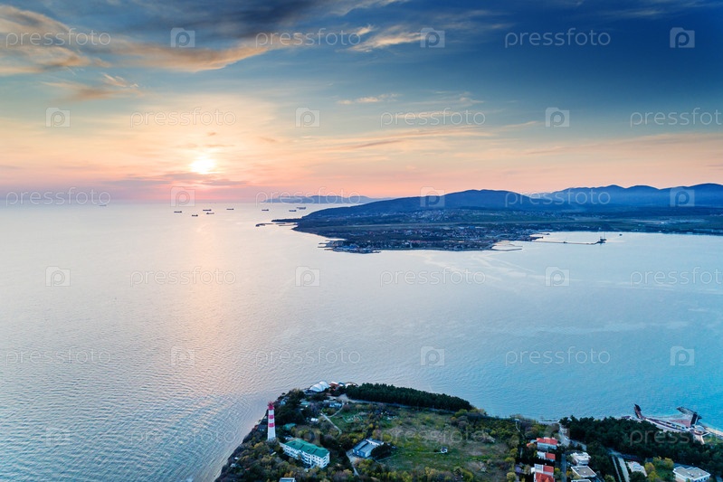 Геленджикский маяк на закате.Маяк стоит на скалистом мысе Толстой.Напротив тонкого мыса и кораблей на рейде в Новороссийске