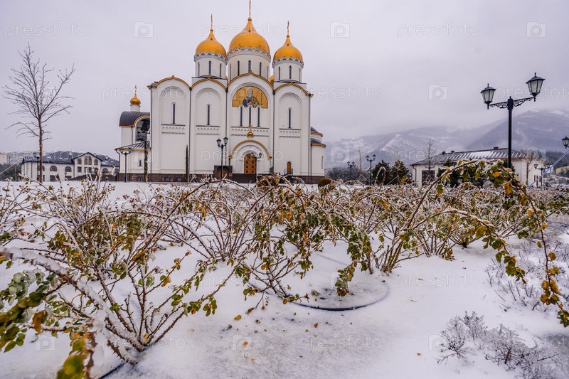 Курорт Геленджик зимой, собор Святого Андрея после морозного дождя. снежное поле с церковью на заднем плане