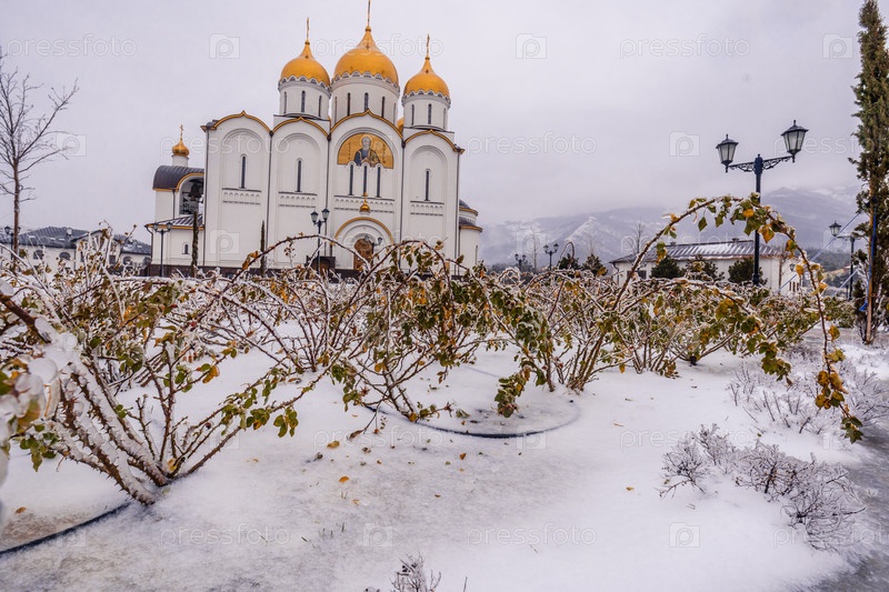 Курорт Геленджик зимой, собор Святого Андрея после морозного дождя. снежное поле с церковью на заднем плане