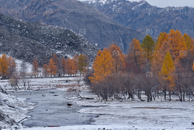 Юг Западной Сибири, горы Алтай. живописный вид на горы, покрытые первым осенним снегом и окруженные желтыми личинками возле деревни Уст-Кан