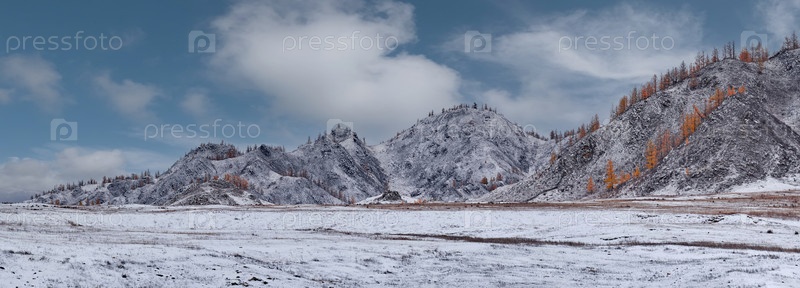Юг Западной Сибири, горы Алтай. живописный вид на горы, покрытые первым осенним снегом и окруженные желтыми личинками возле деревни Уст-Кан