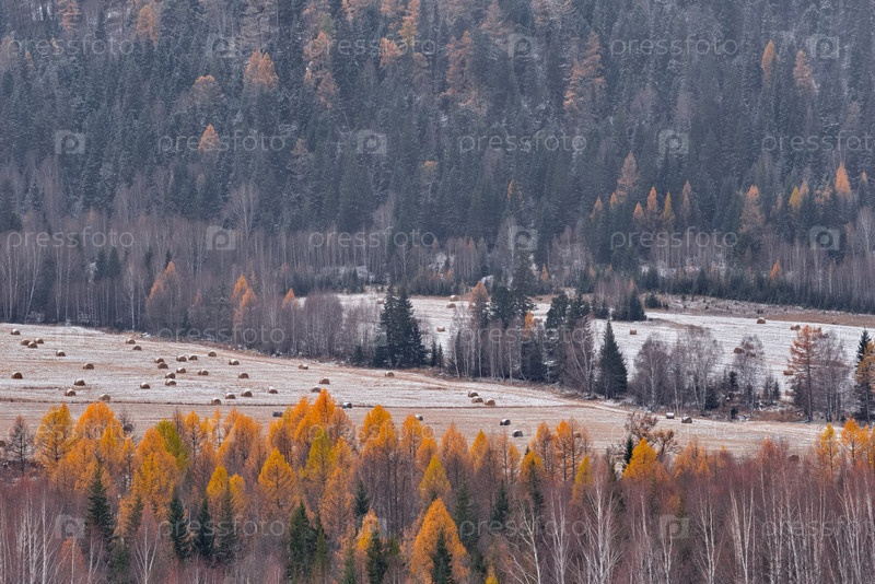 Юг Западной Сибири, горы Алтай. живописный вид на горы, покрытые первым осенним снегом и окруженные желтыми личинками возле деревни Уст-Кан
