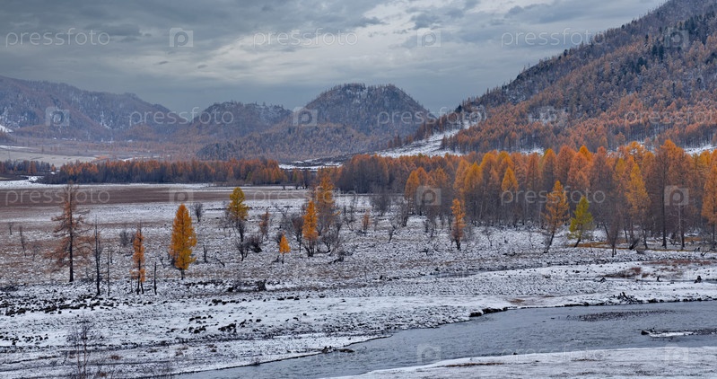 Юг Западной Сибири, горы Алтай. живописный вид на горы, покрытые первым осенним снегом и окруженные желтыми личинками возле деревни Уст-Кан