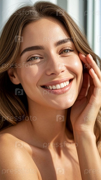 Молодая привлекательная девушка с красивыми чертами лица держит руки за лицо