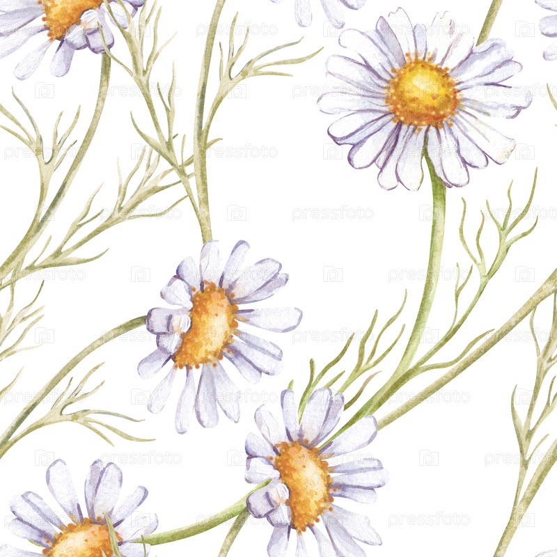 Бесшовный рисунок с белыми ромашками. Иллюстрация акварели выделена на белом фоне. Бесшовный ботанический фон с дикими цветами. Шаблон для текстиля, посуды, обоев и упаковки