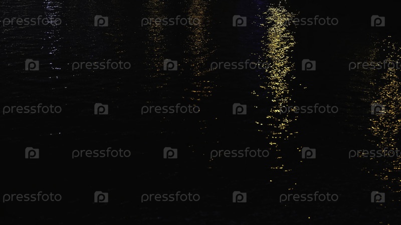 Закрытие водохранилища с темной поверхностью воды ночью при отражении от городских огней.Концепция.Прекрасные ночные пейзажи