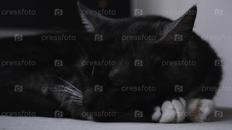 Черный кот - красивые кошачьи лапы, кот лежит на полу дома на белом фоне