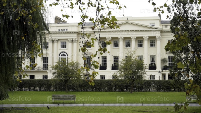 Зеленый городской парк на фоне красивых старинных зданий в пасмурную погоду.Зелёный парк в старом городе с прекрасной архитектурой на пасмурном фоне