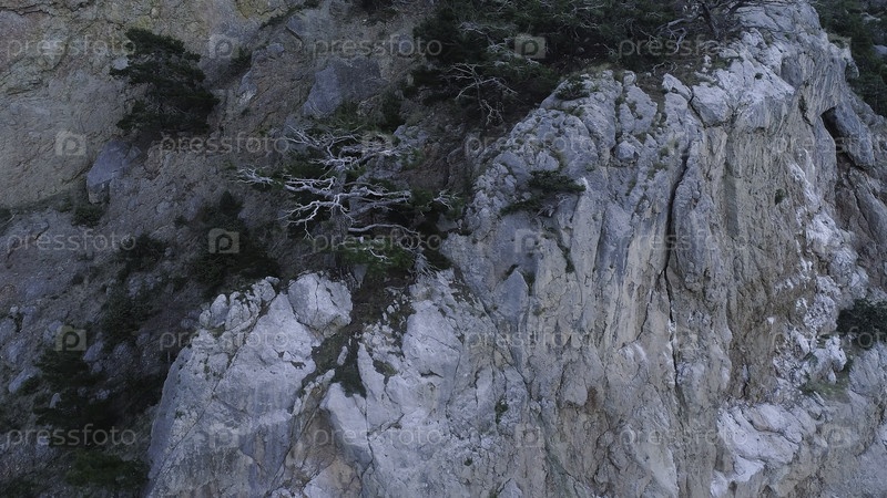 Вид сверху на скалистую струнную стену со редкой растительностью на выступах. Эрозия создает свободное нестабильное поверхность каменистого массива