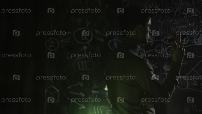 Мужчина пишет на стеклянной доске ночью.Сток.Непризнанный гений записывает формулы на доску