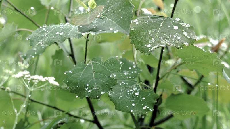 Зеленые листья, покрытые капельками росы. Резервные кадры. Красивые листья куста покрыты каплями после дождя. Освежающий вид на листья с росой