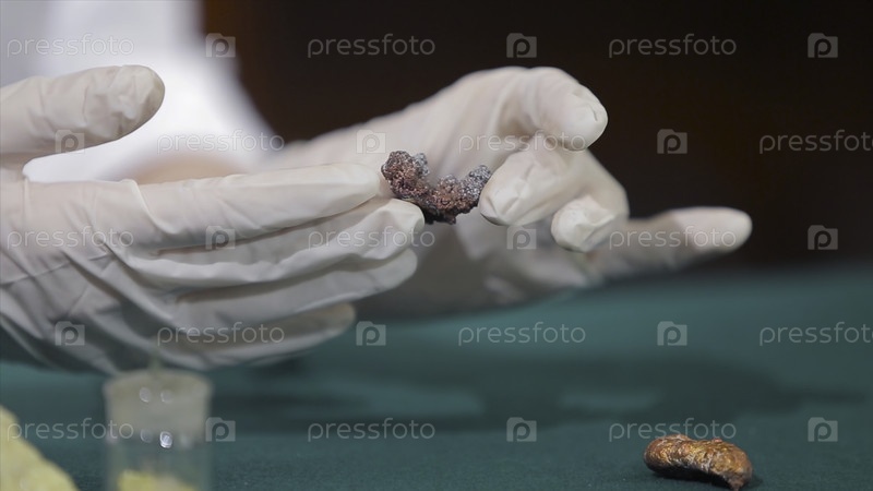 Ученый или археолог держит камни или минералы.Люди с археологическими образцами в руках