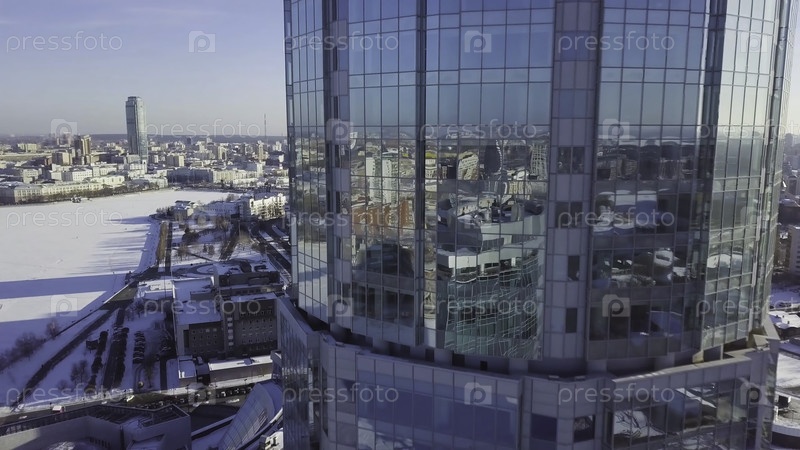 Стекло небоскребов с облаками, Бизнес-концепция архитектуры.Отражение города в окнах башни