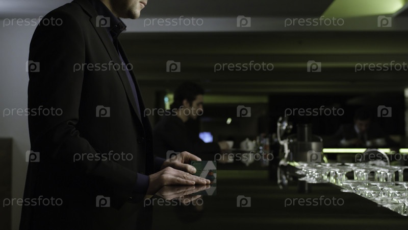 Сток, бизнесмен оплачивает счет с помощью карты в ресторане