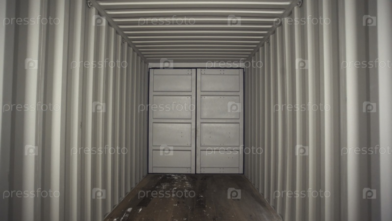 Большая металлическая белая дверь и белый металлический гофрированный проход с деревянным полом