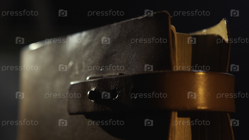 Закрытая старая кожаная книга с кожаными ремнями в темной комнате.Винтажные книги со кожным покрытием, крупный план