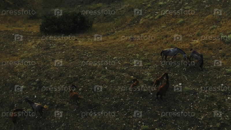 Живописный вид с конями, пасущимися на лугу на склоне холма.Стреляйте.Вид лошадей, пасущихся на склоне