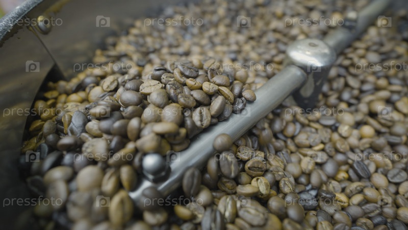 Несколько кофейных зерен перемешивают и обжаряют. Продолжайте. Специальная машина смешивает кофе для термической обработки. Обжарение кофе в машине