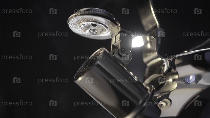 Закрывая пар, выходящий из потока чайника. Продолжайте. На черном фоне стоит кипяченый металлический чайник. Красивый металлический чайник с кипящей водой
