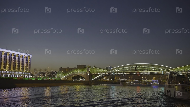 Красивые светящиеся здания на набережной. Идите дальше. Поездка на лодке вдоль городского канала с видом на сияющие здания. Светящие здания и мосты возле городского канала вечером