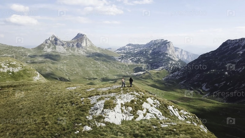 Вид сверху на горную панораму.Сток.Гитаристы на краю скалы.Увлекательная сцена музыкантов, играющих на крутом грунте
