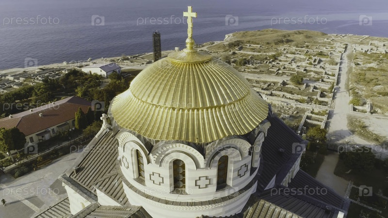 Золотые купола православного Владимирского собора в Херсонесе на фоне голубого моря Самый большой храм на Крымском полуострове Вид сверху храма Херсонесса
