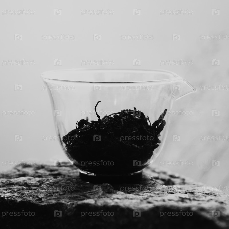 Минималистическая чёрно-белая фотография чайных листьев в прозрачной чашке, подчеркивающая их естественную красоту