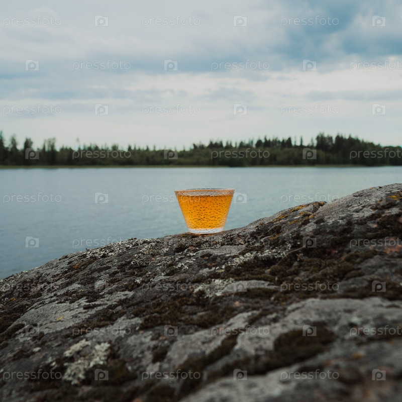 Красиво спокойный вид на озеро, показывающий освежающий напиток, расположенный на скале, захватывающий прекрасную красоту природы