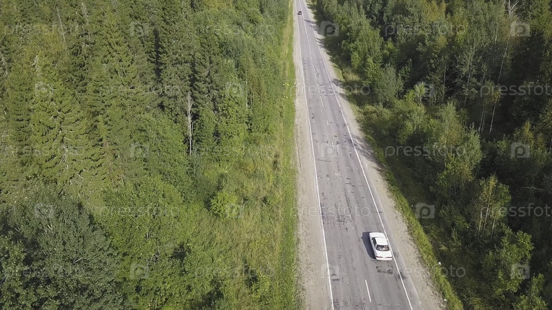 Вид с воздуха лесной равнины и автомобиля, который едет по шоссе. Клип. Вид на автомобиль, движущийся по лесной дороге