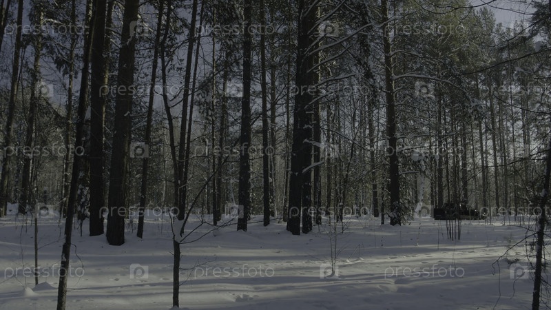 Яркий солнечный сосновый лес в снегу, прекрасный зимний пейзаж в лесу