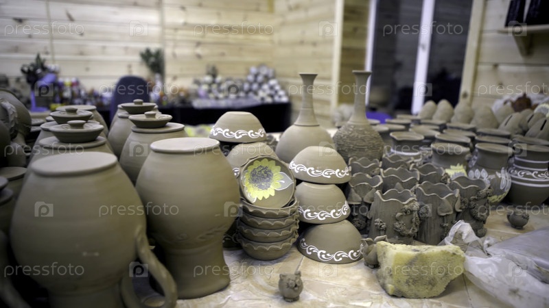 Много самодельной керамики. резервные кадры. серая керамика со многими одинаковыми банками и тарелками на столе в мастерской. керамическая мастерская