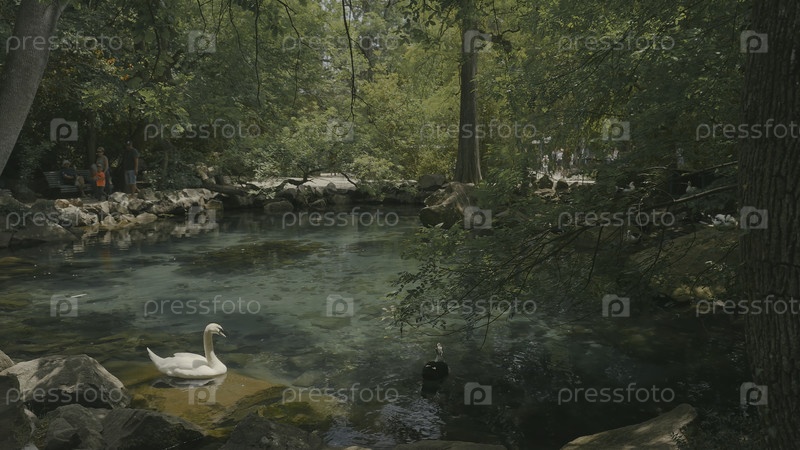 Пара лебедей плавает в зеленом парковом пруду. Идите дальше. Красивый чистый водоем с плывущими лебедями на фоне зелёных деревьев. Райский зеленый парк с прудом и лебедями