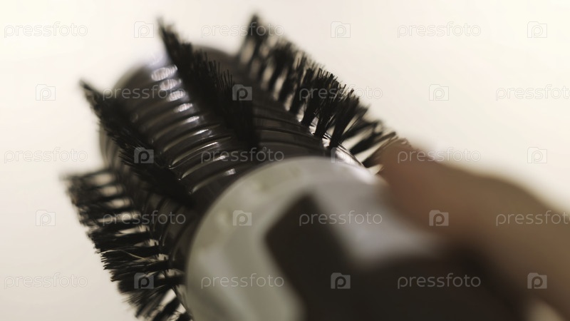 Девушка держит объемную кисть для выпрямления волос, изолированную на белом фоне.Концепция.Женщина нажимает кнопки автоматической щетки для волос, которая вращается в обе стороны