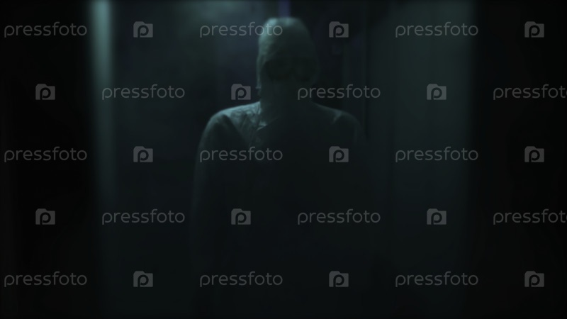 Темный размытый коридор больницы с силуэтом мужчины в комбинезоне. неузнаваемый человек в защитном костюме, интерьер комнаты ужасов
