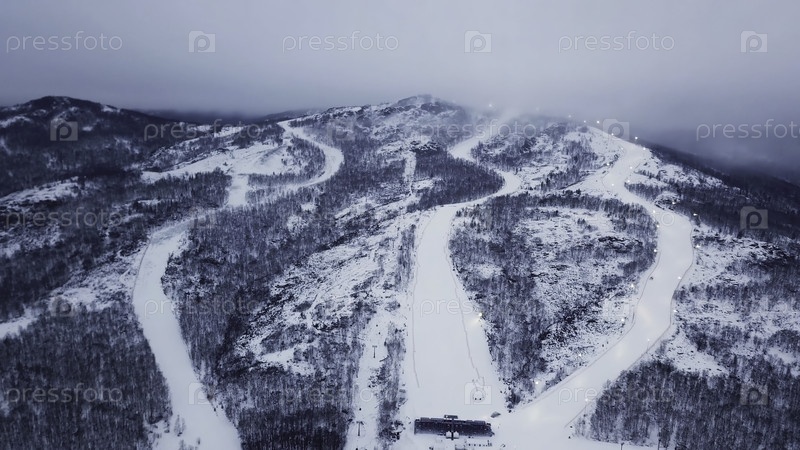 Вид на горнолыжный курорт в пасмурную погоду. резервные кадры. красивые снежные горы с лесами и лыжными трассами на фоне тумана и облачного зимнего неба