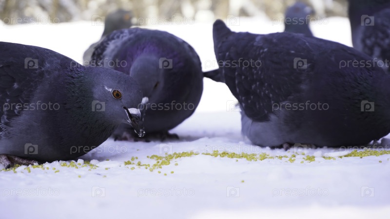 Голуби едят в снегу, кормят голубей зимой, клеют зерна на холодный зимний день