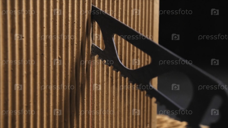 Концепция строительства и сооружения. Близкий план автоматической пилы, режущей кирпич в темной мастерской