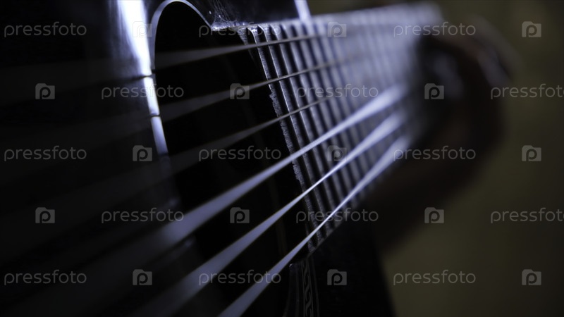 Руки мужчины играют на черной акустической гитаре.Концепция уроков музыки