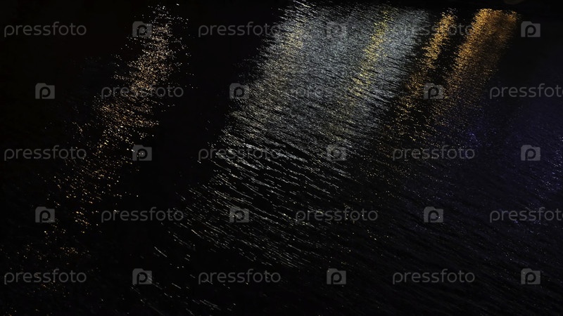 Закрытие водохранилища с темной поверхностью воды ночью при отражении от городских огней.Концепция.Прекрасные ночные пейзажи