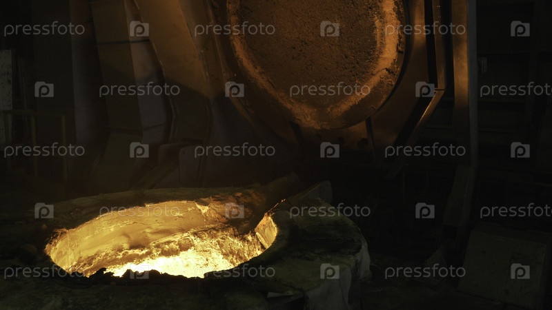Закрытие высокой печи путем плавки жидкой стали в горячем цехе завода, концепция тяжелой металлургии. Процесс производства стали на фабрике
