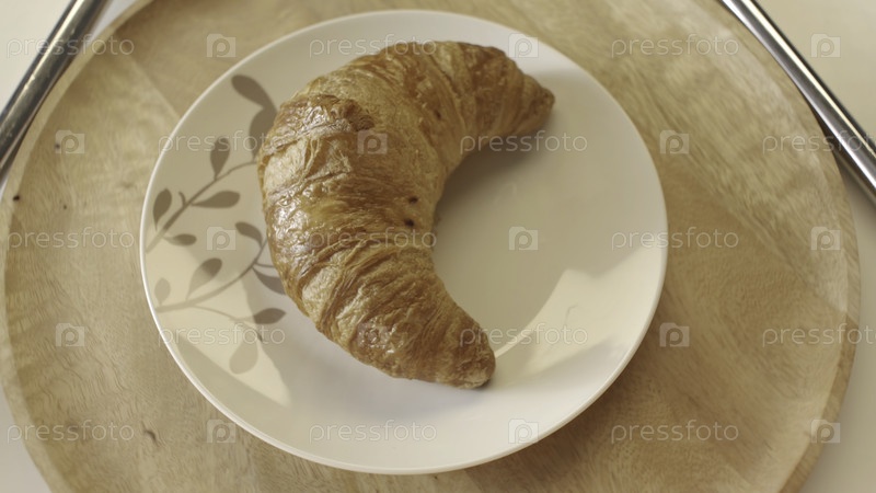 Вид сверху на свежий и вкусный кроассан, лежащий на белой тарелке с цветочными орнаментами и вращающийся на деревянной круглом доске