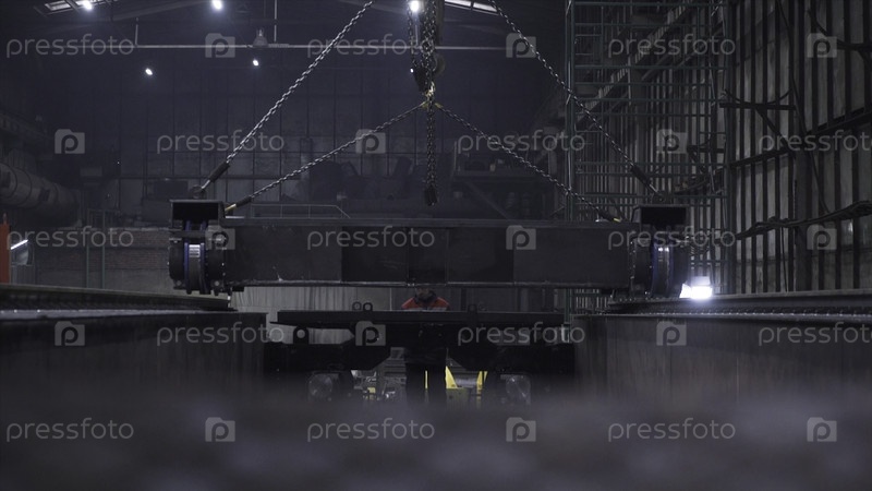 Платформа автомобиля находится на рельсах на заводе. Клип. Металлическая платформа поезда с колесами была установлена на рельсах на фабрике. Создание поездов на машиностроительном предприятии