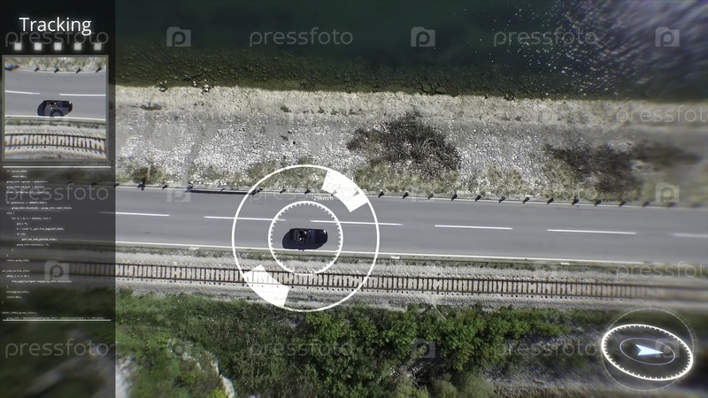 Шпионский БПЛА над городской зоной, наблюдающий за автомобилем со спутника