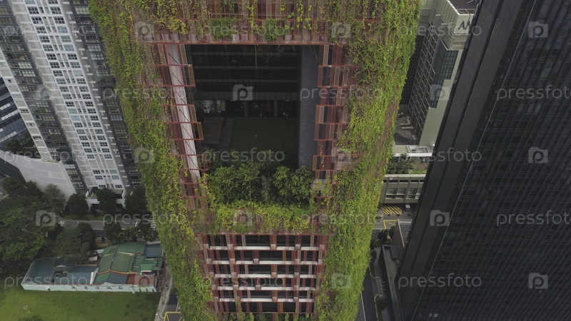 Традиционные китайские магазины Peranakan и современная архитектура отеля Oasia. Съемка. Вид на многоэтажные офисные небоскребы и частные жилые районы в Tanjong Pagar