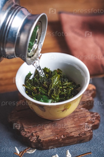 В спокойной и уютной обстановке мирный момент разворачивается, когда теплая вода мягко льется по крутым зеленым чайным листьям
