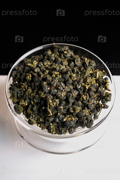 Потрясающий ближайший вид высококачественных сушеных листьев травяного чая, красиво расположенных в стильной стеклянной миске